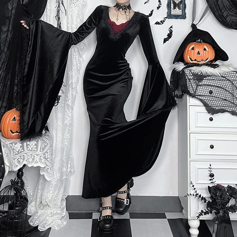 Women's Gothic Plunging Flared Sleeved Velvet Witch Dress